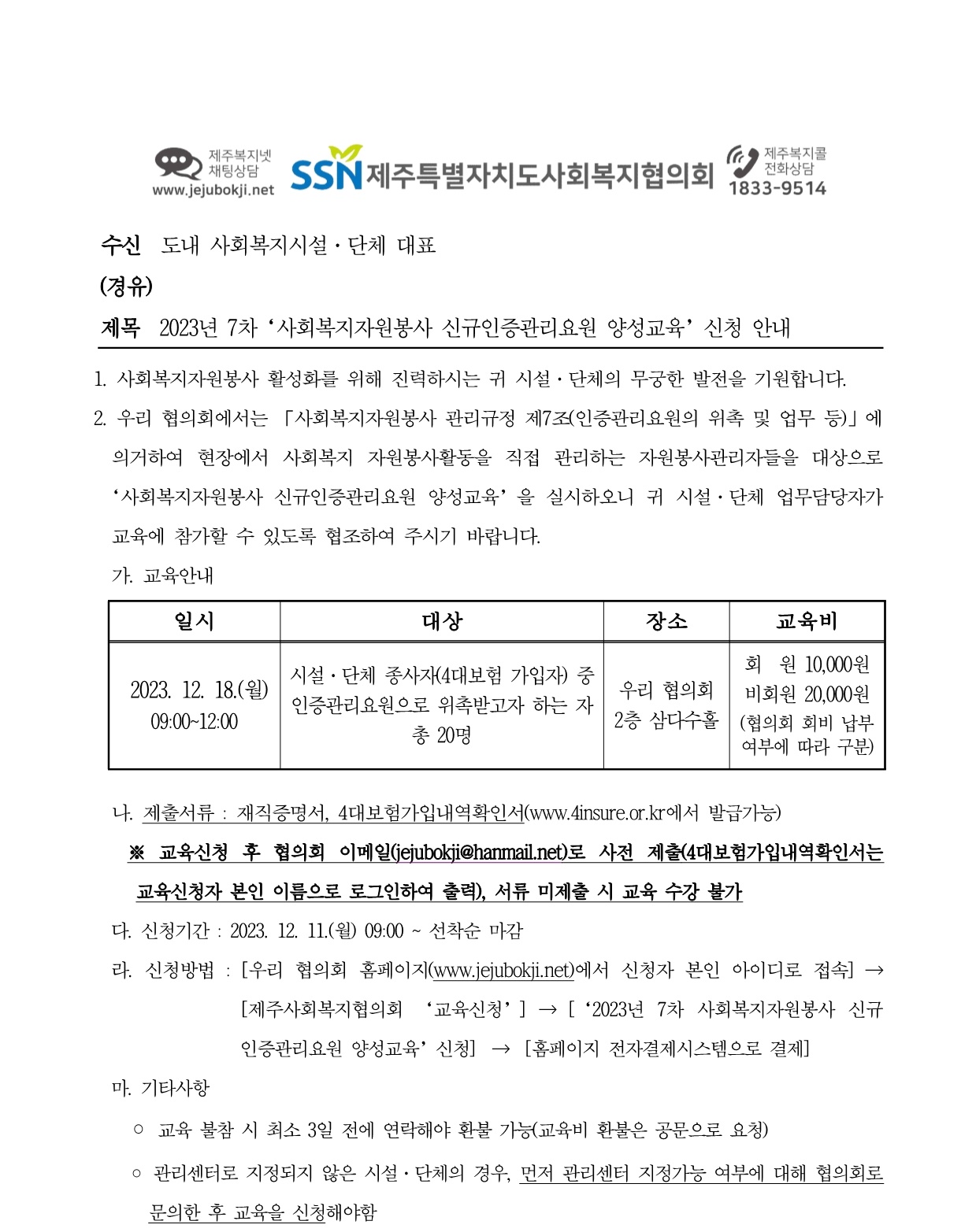 2023년 7차 사회복지자원봉사 신규인증관리요원 양성교육 신청 안내
