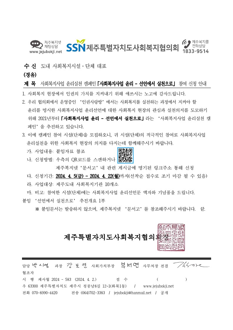 2024 사회복지사업 윤리실천 캠페인 「선언에서 실천으로」 신청 안내