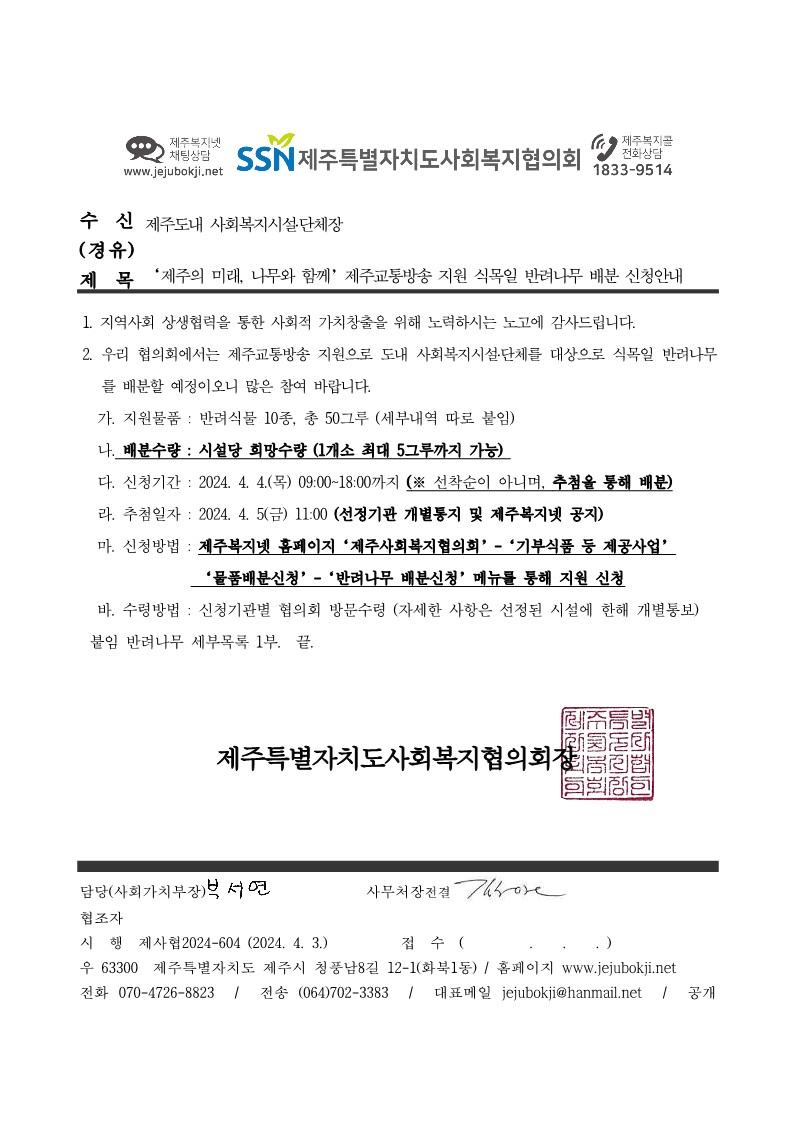 ‘제주의 미래, 나무와 함께’제주교통방송 지원 식목일 반려나무 배분 신청안내