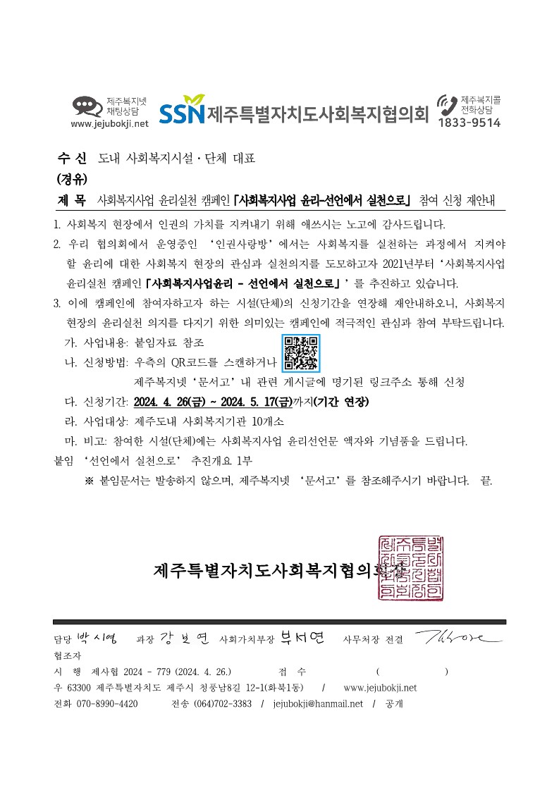 2024 사회복지사업 윤리실천 캠페인「사회복지사업 윤리-선언에서 실천으로」 참여 신청 재안내