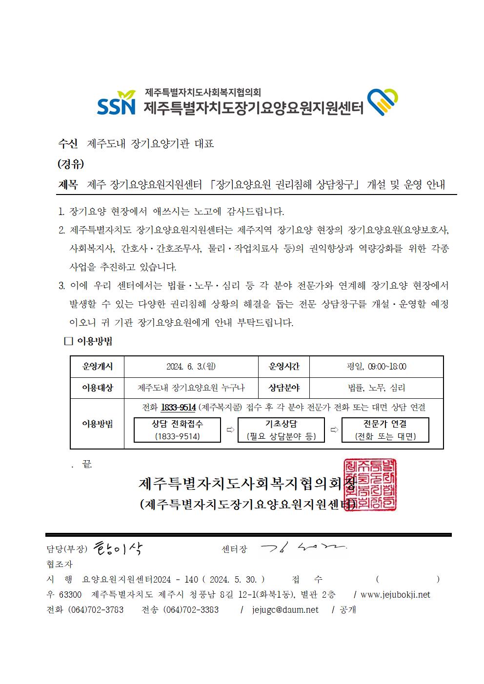 제주 장기요양요원지원센터 「장기요양요원 권리침해 상담창구」 개설 및 운영 안내