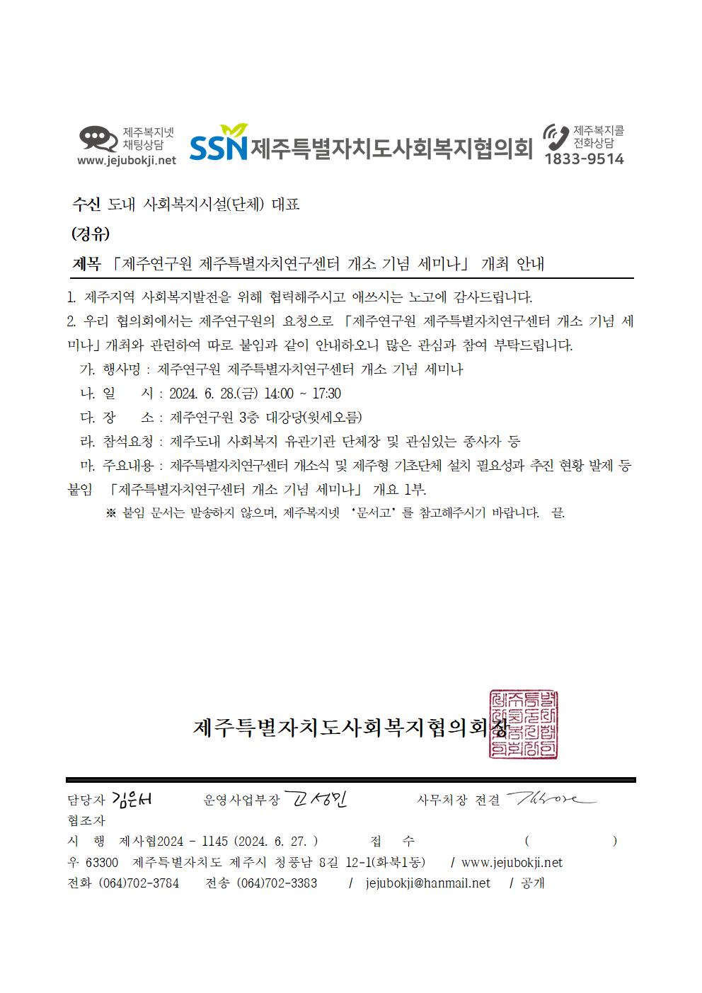 「제주연구원 제주특별자치연구센터 개소 기념 세미나」 개최 안내