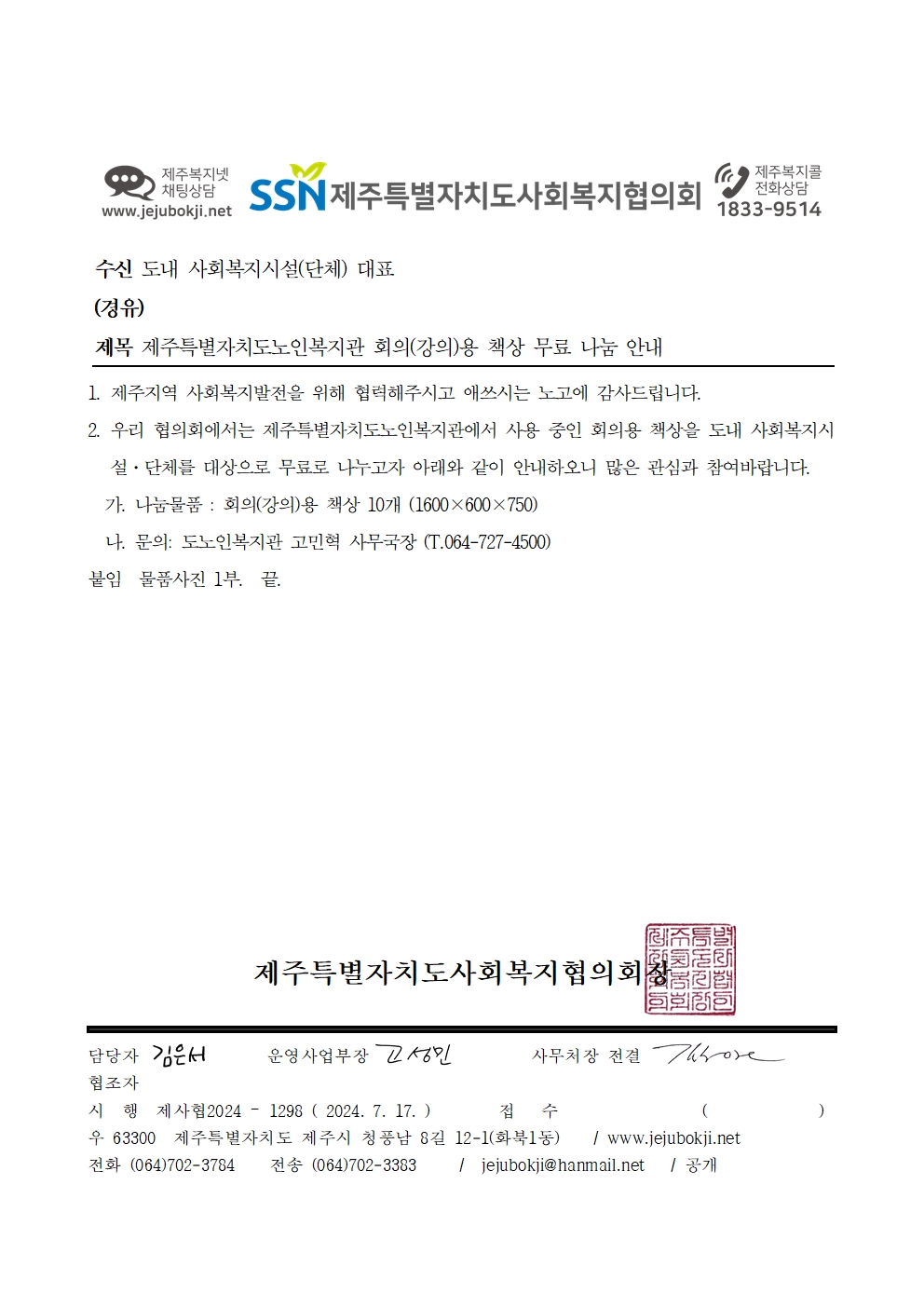 제주특별자치도노인복지관 회의(강의)용 책상 무료 나눔 안내