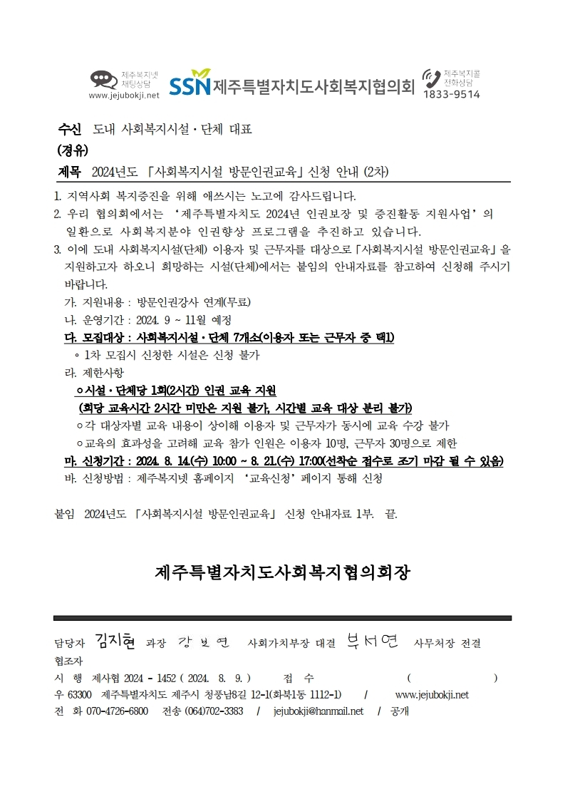 2024년도 「사회복지시설 방문인권교육」 신청 안내 (2차)