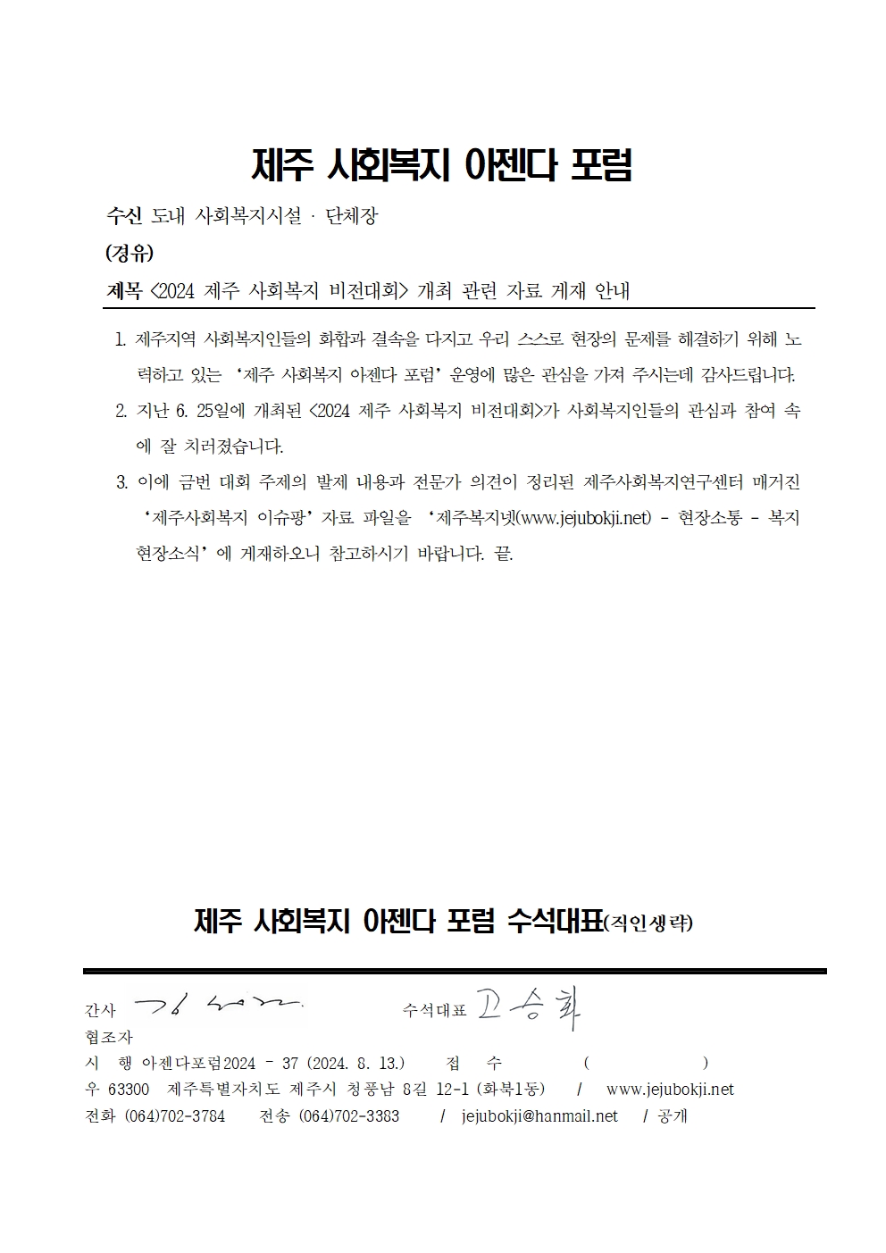 <2024 제주 사회복지 비전대회> 개최 관련 자료 게재 안내