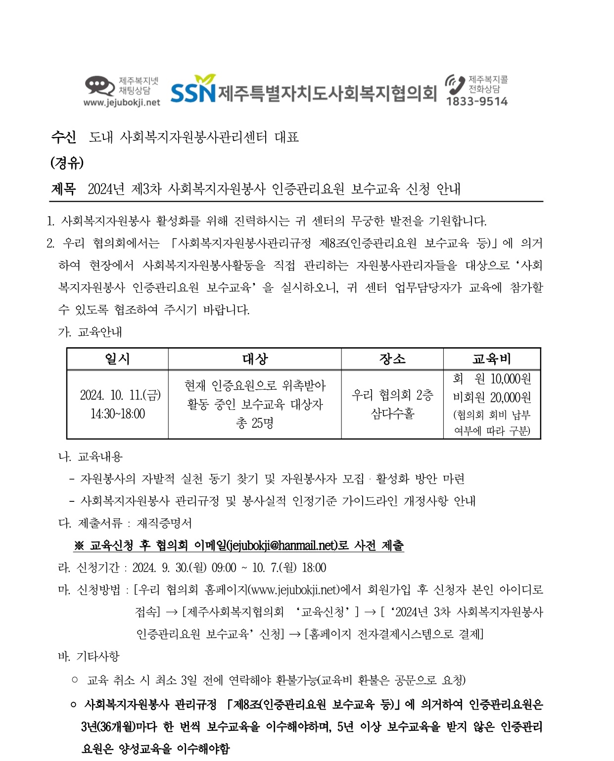 2024년 제3차 사회복지자원봉사 인증관리요원 보수교육 신청 안내