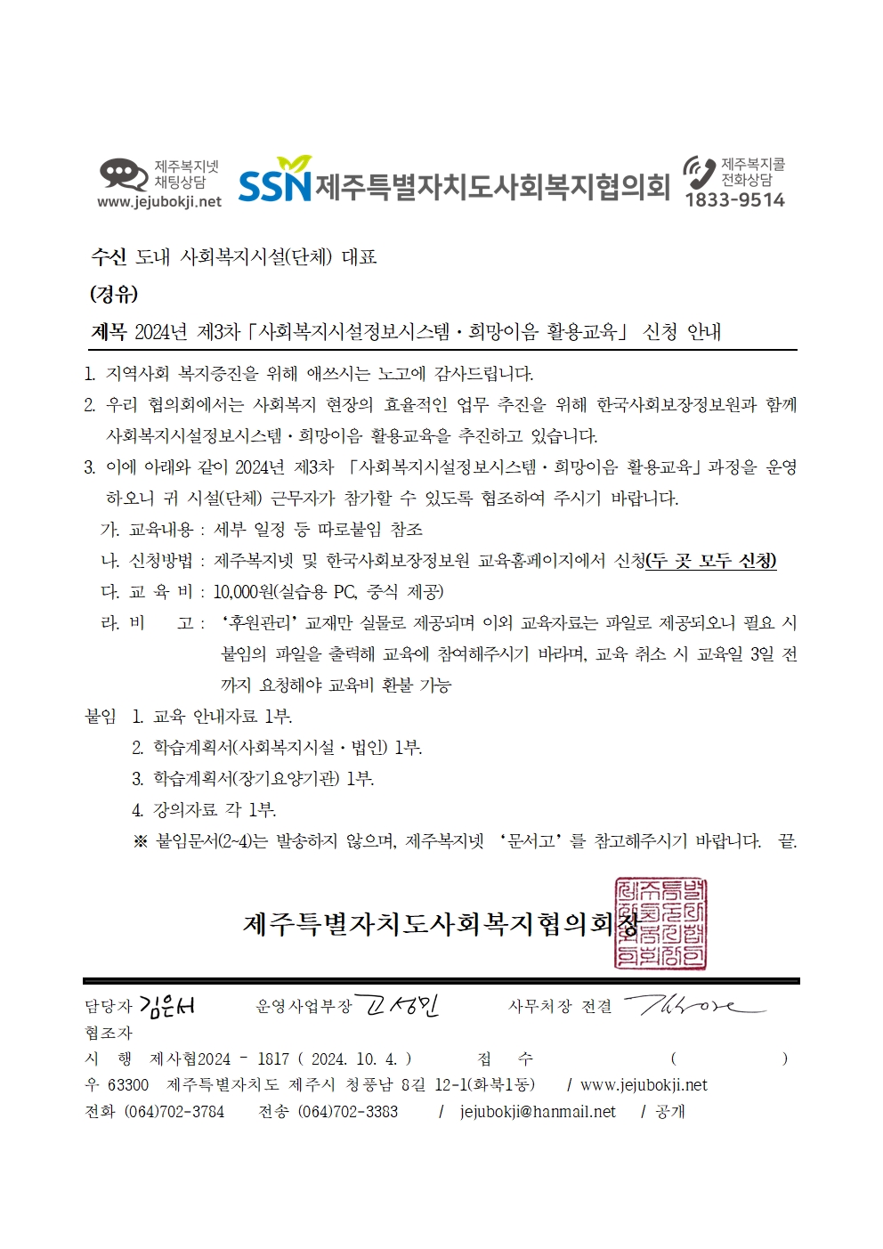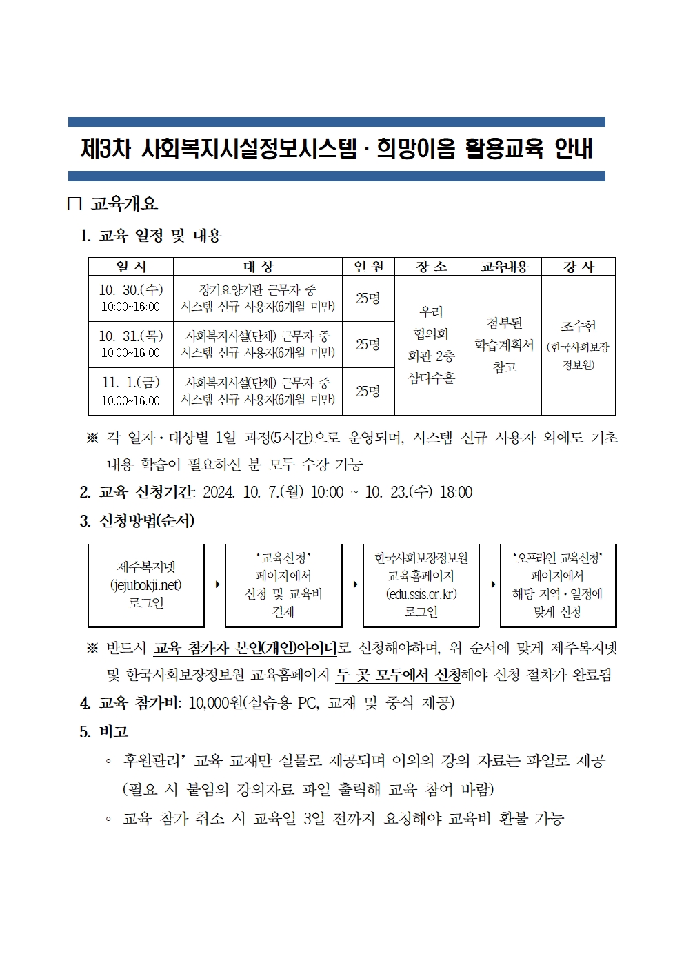 2024년 제3차 「사회복지시설정보시스템 · 희망이음 활용교육」 신청 안내