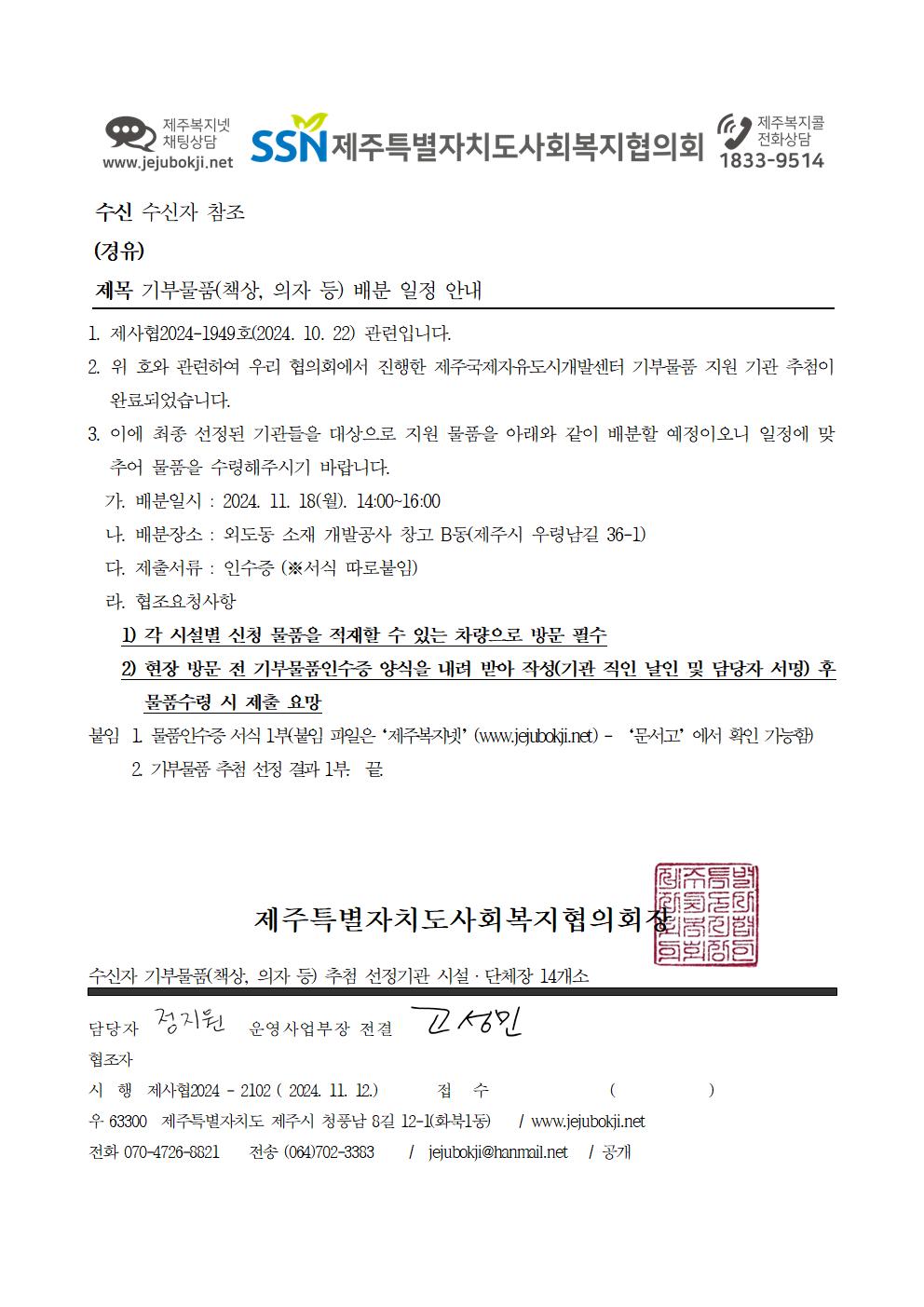 기부물품(책상, 의자 등) 배분 일정 안내