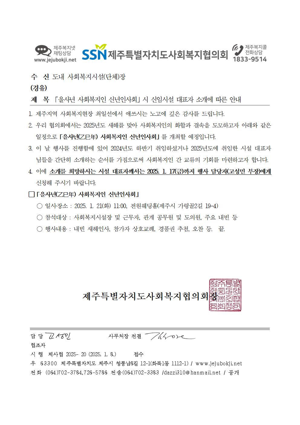 「을사년 사회복지인 신년인사회」시 신임시설 대표자 소개에 따른 안내