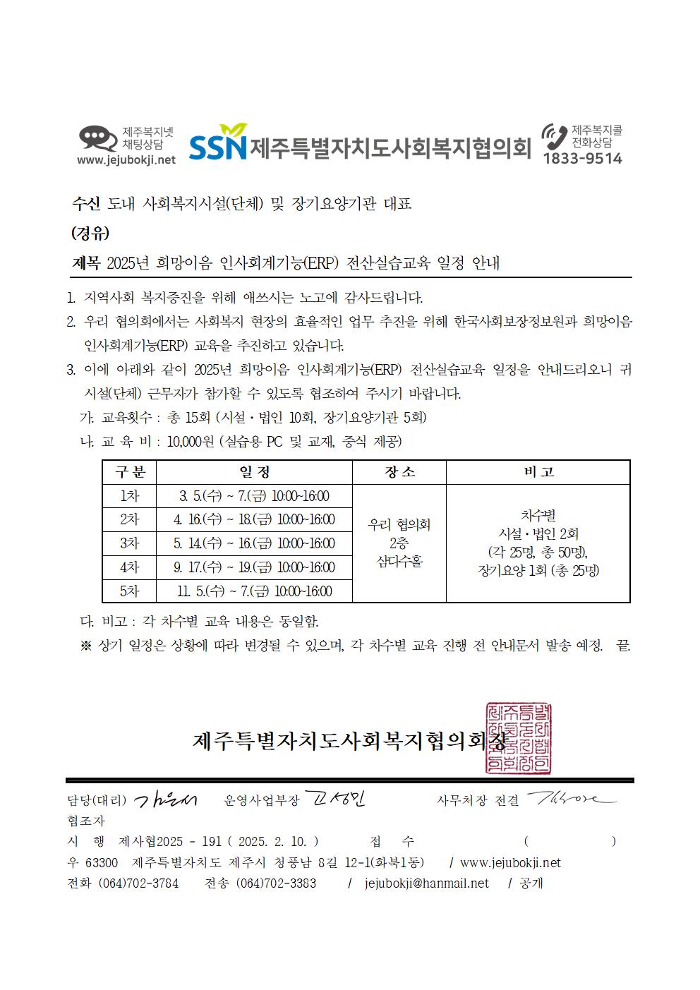 2025년 희망이음 인사회계기능(ERP) 전산실습교육 일정 안내