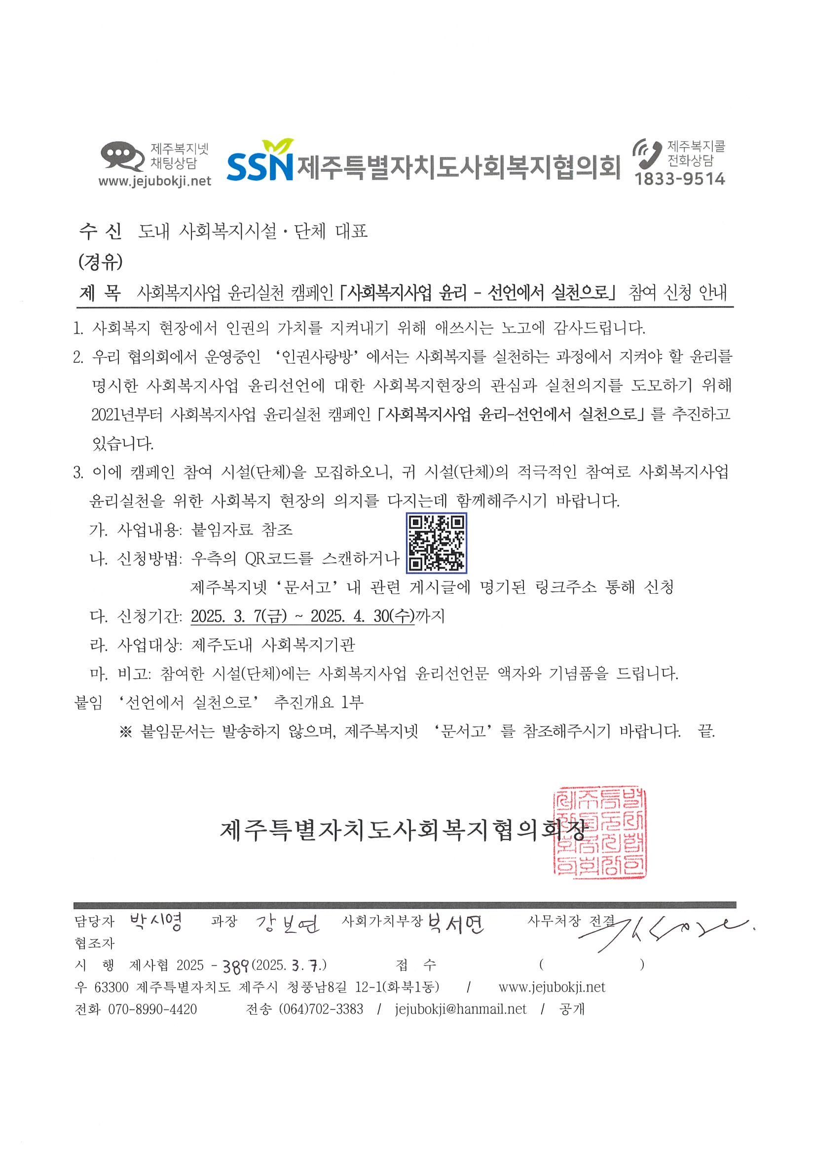 2025사회복지사업 윤리실천 캠페인 「선언에서 실천으로」참여 신청안내
