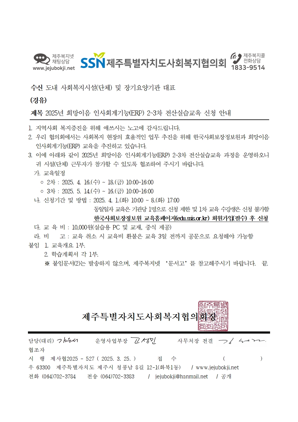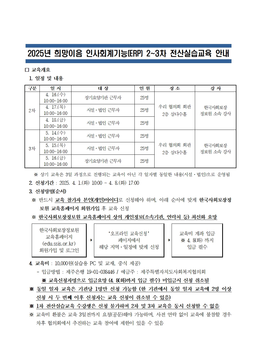 2025년 희망이음 인사회계기능(ERP) 2~3차 전산실습교육 신청 안내