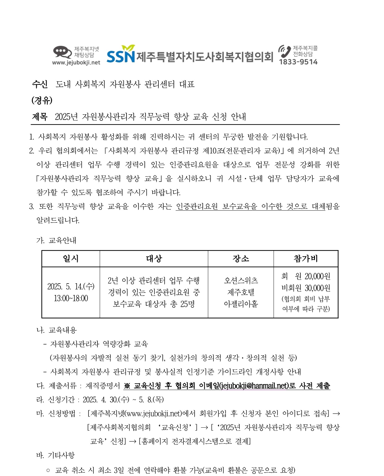 2025년 자원봉사관리자 직무능력 향상 교육 신청 안내