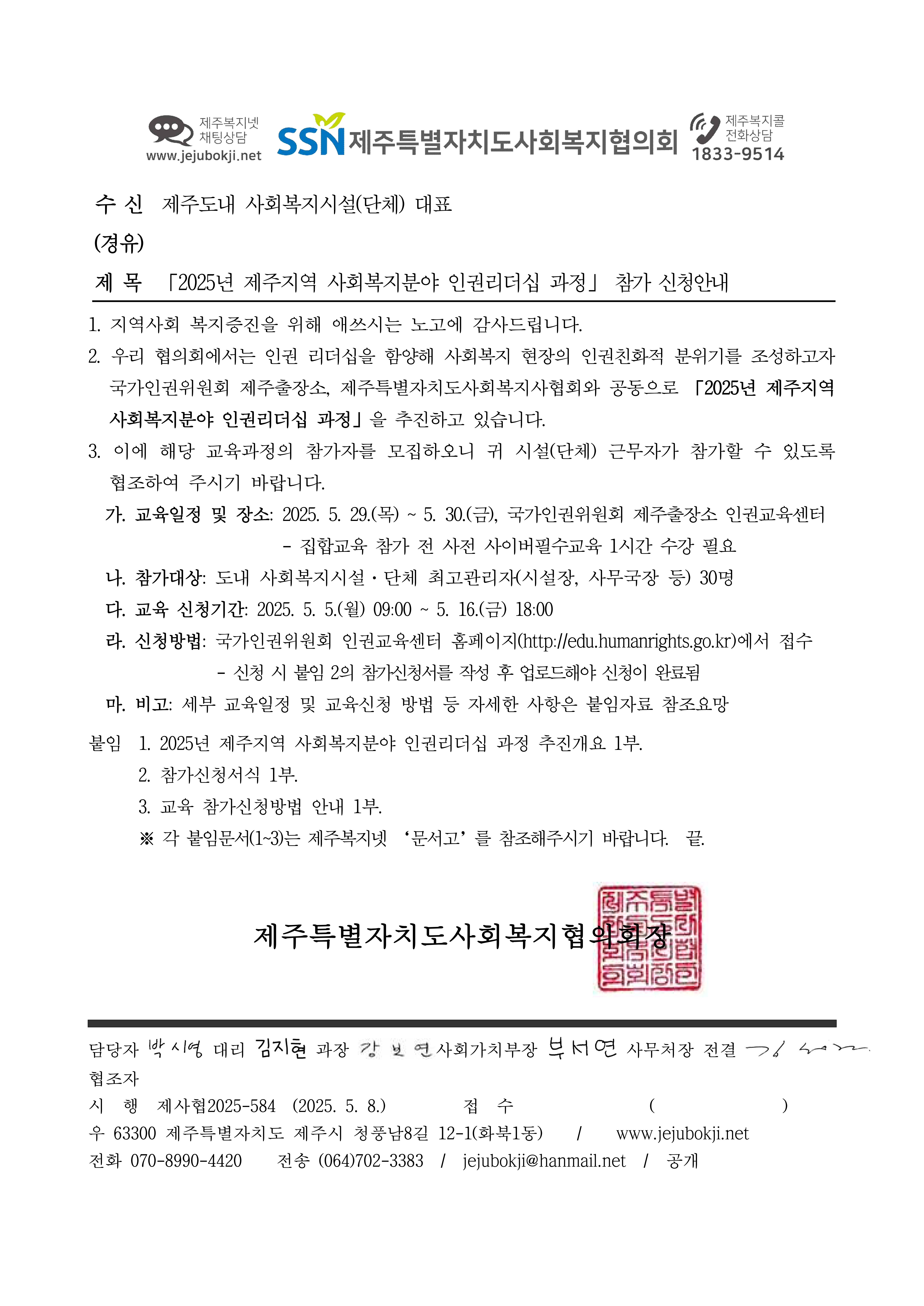 「2025년 제주지역 사회복지분야 인권리더십 과정」 참가 신청안내