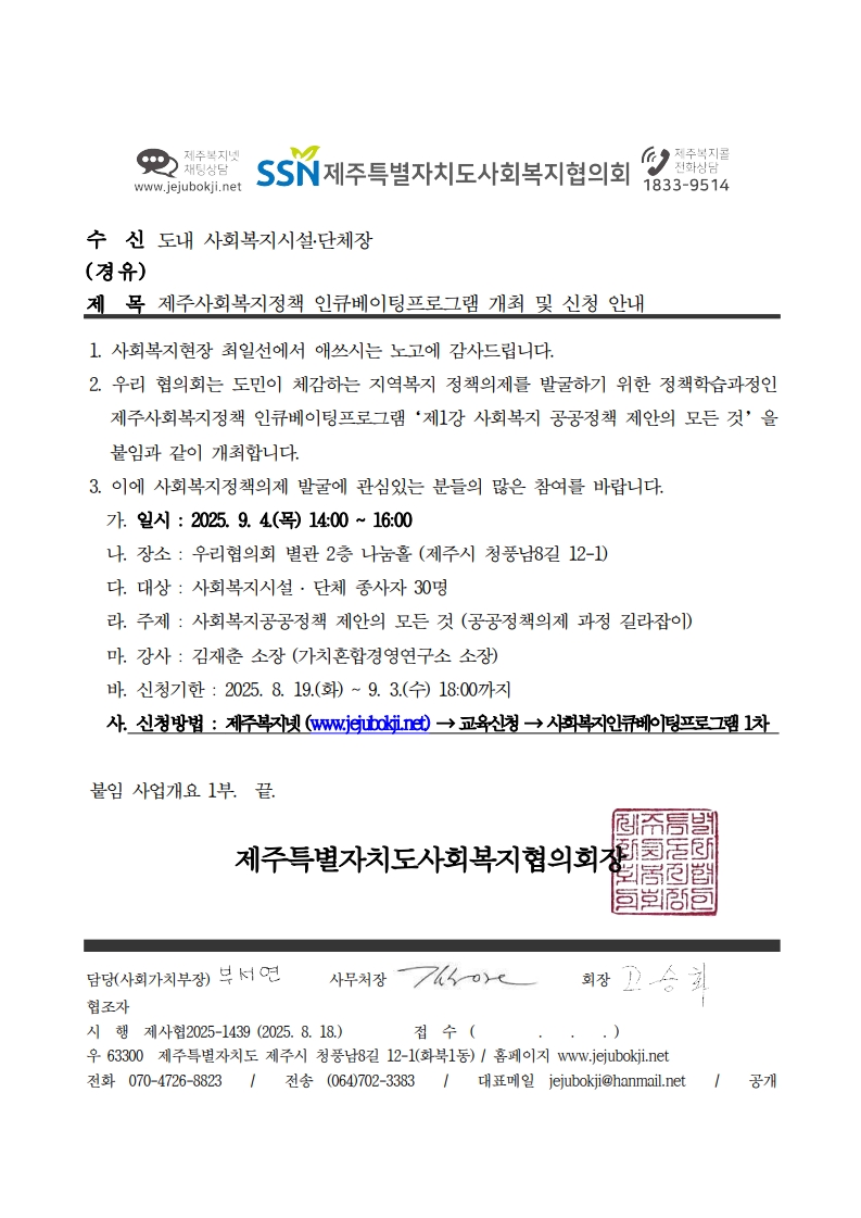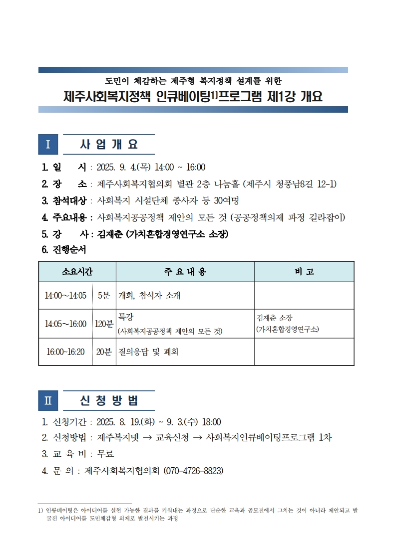 제주사회복지정책 인큐베이팅프로그램 개최 및 신청 안내