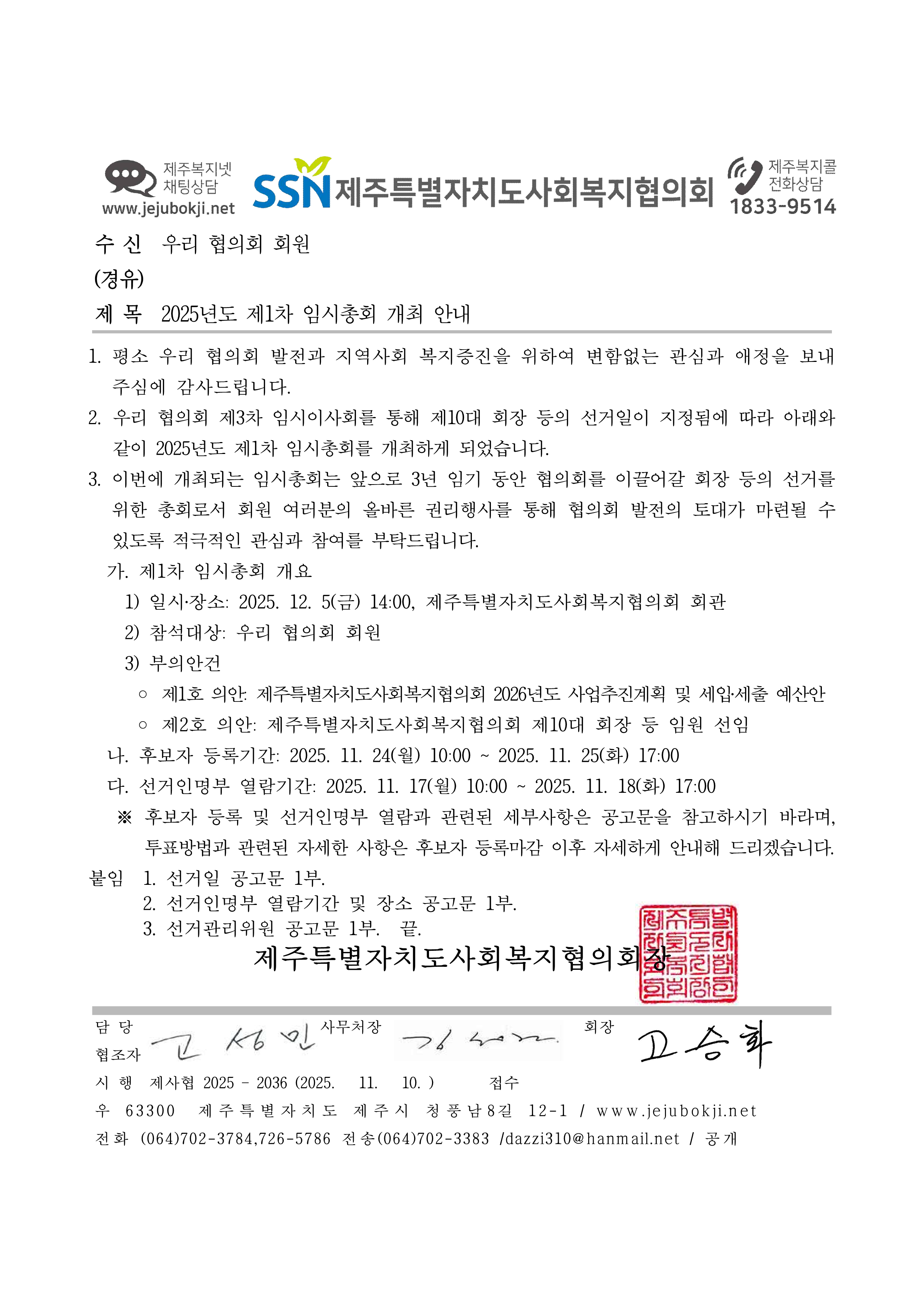 2025년도 제1차 임시총회(제10대 회장 선거일) 개최안내