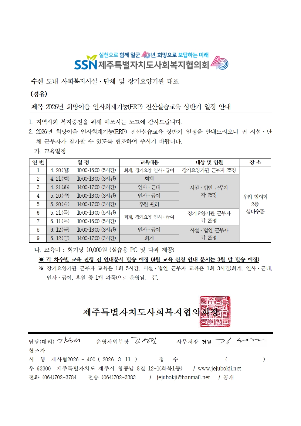 2026년 희망이음 인사회계기능(ERP) 전산실습교육 상반기 일정 안내