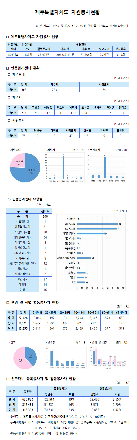 제주특별자치도 자원봉사현황(2015. 7. 30.기준)