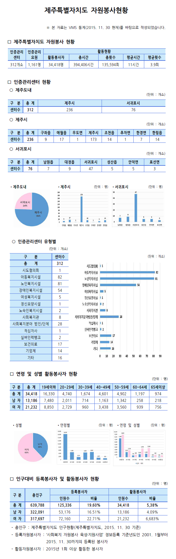 제주특별자치도 자원봉사현황(2015. 11. 30 기준)