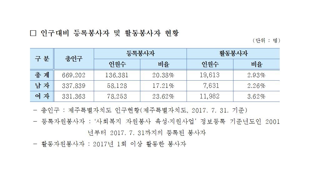 제주특별자치도 자원봉사현황(2017. 7. 31. 기준)