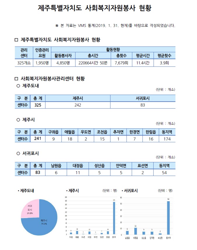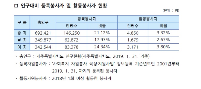 제주특별자치도 자원봉사현황(2019. 1. 31기준)