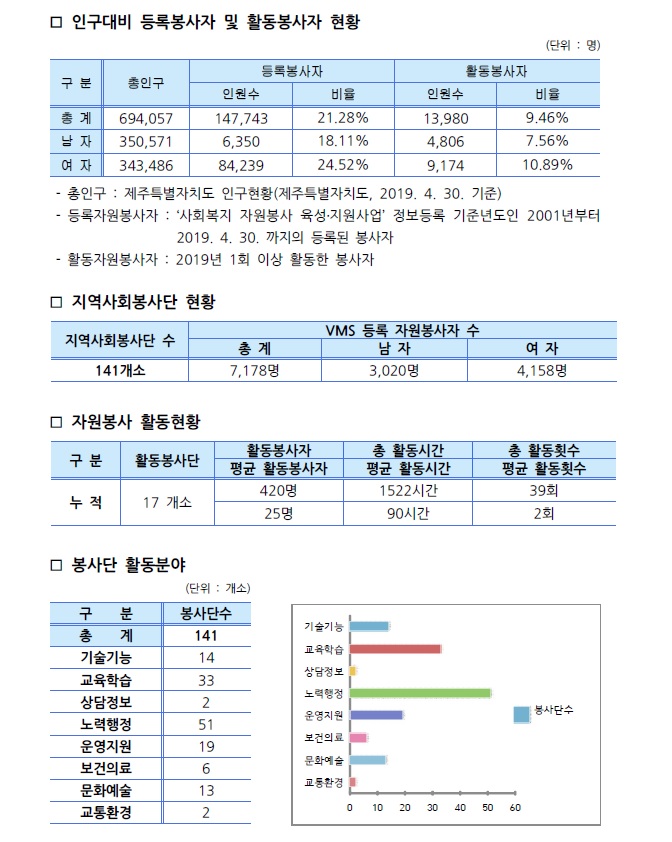 제주특별자치도 자원봉사현황(2019. 4. 30기준)