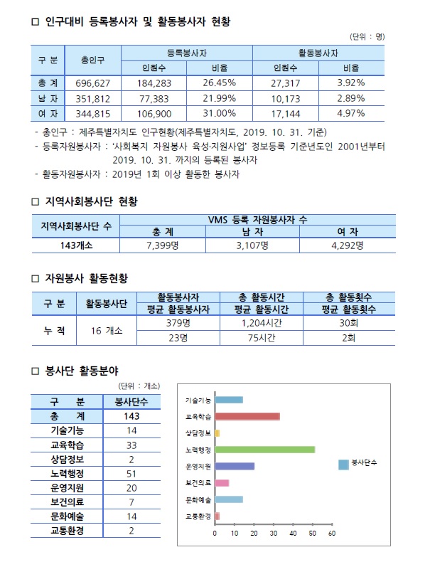 제주특별자치도 자원봉사현황(2019. 10. 31기준)
