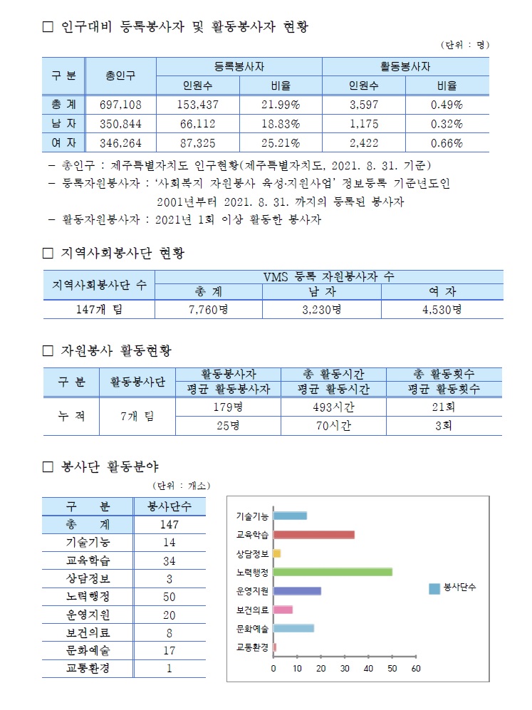 제주특별자치도 자원봉사현황(2021. 8. 31 기준)