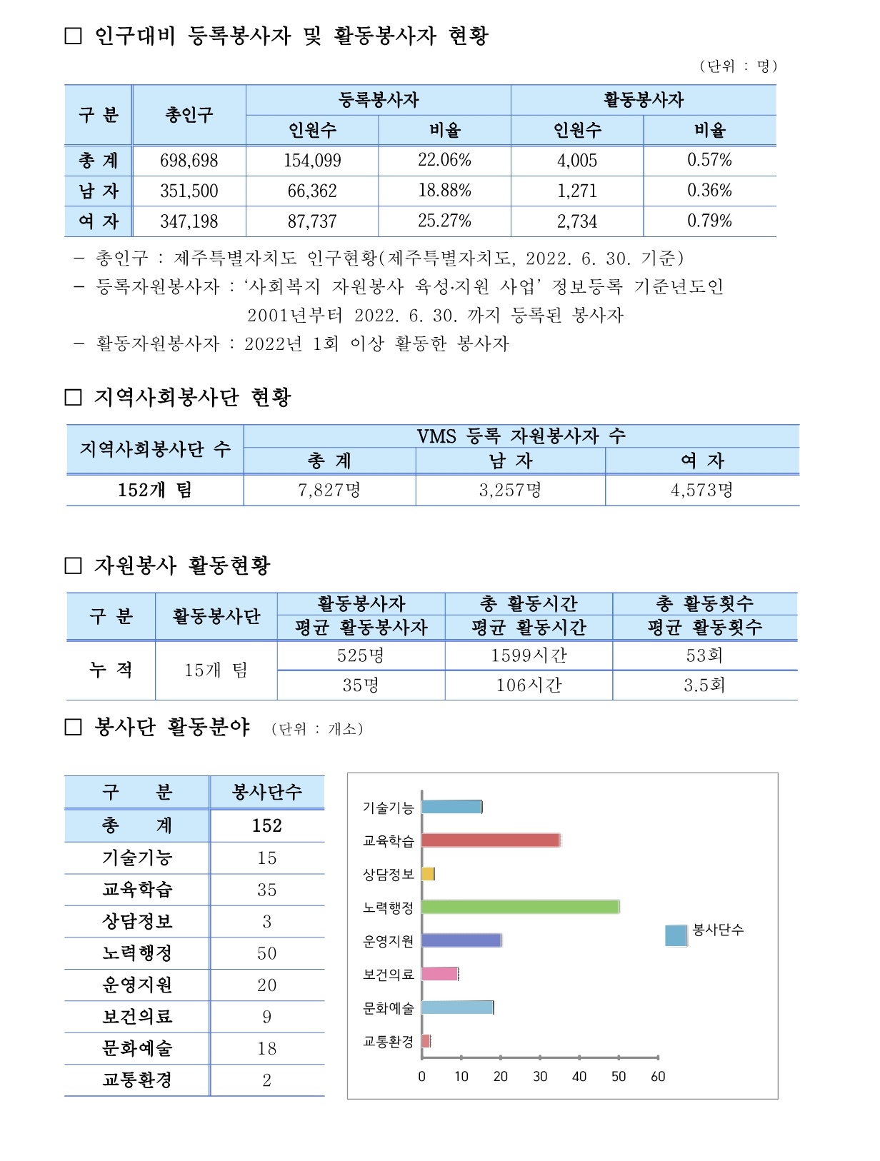 제주특별자치도 자원봉사현황 (2022. 6. 30 기준)