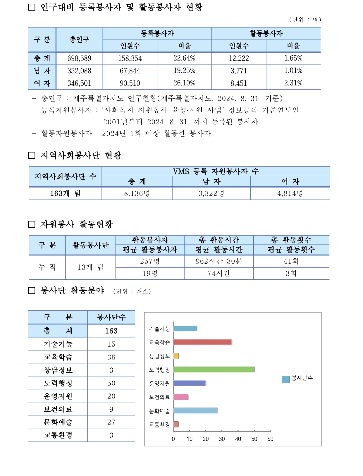 제주특별자치도 자원봉사 현황 (2024. 8. 31. 기준)