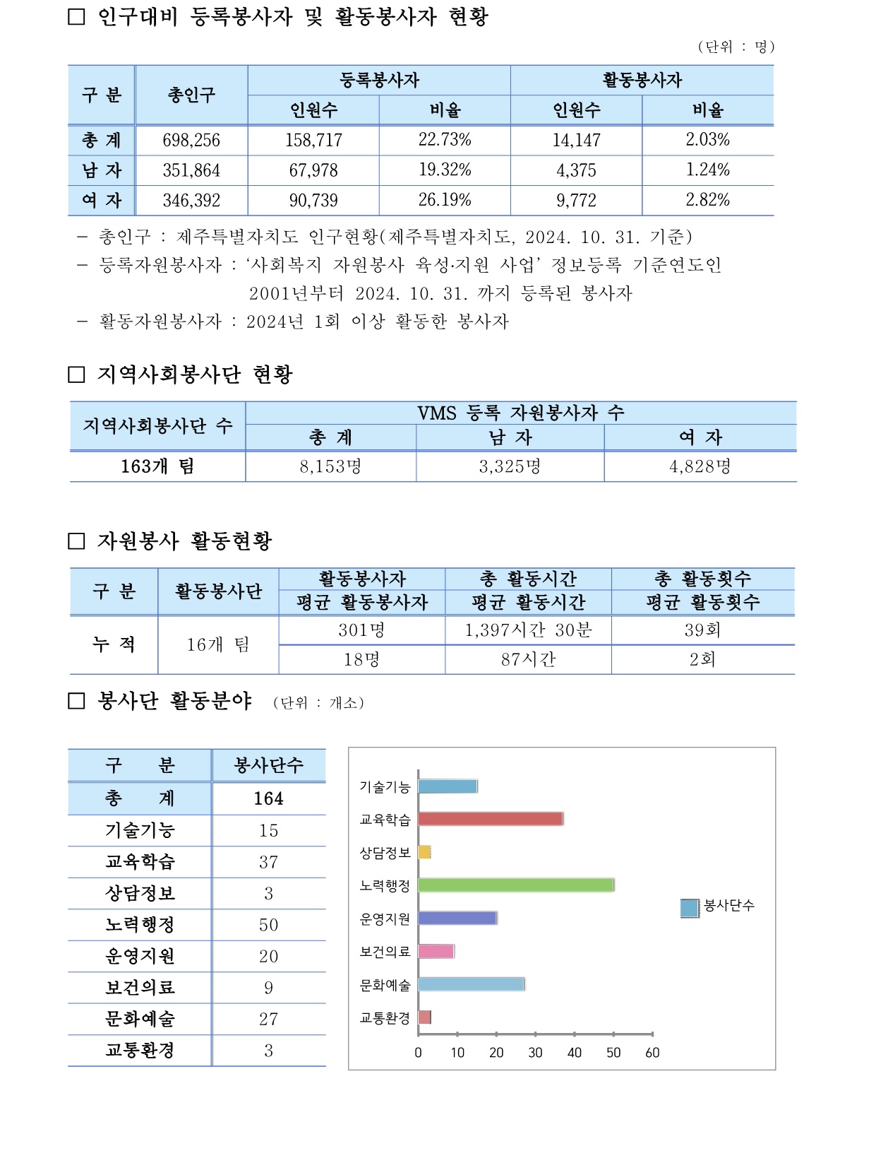 제주특별자치도 자원봉사 현황 (2024. 10. 31. 기준)