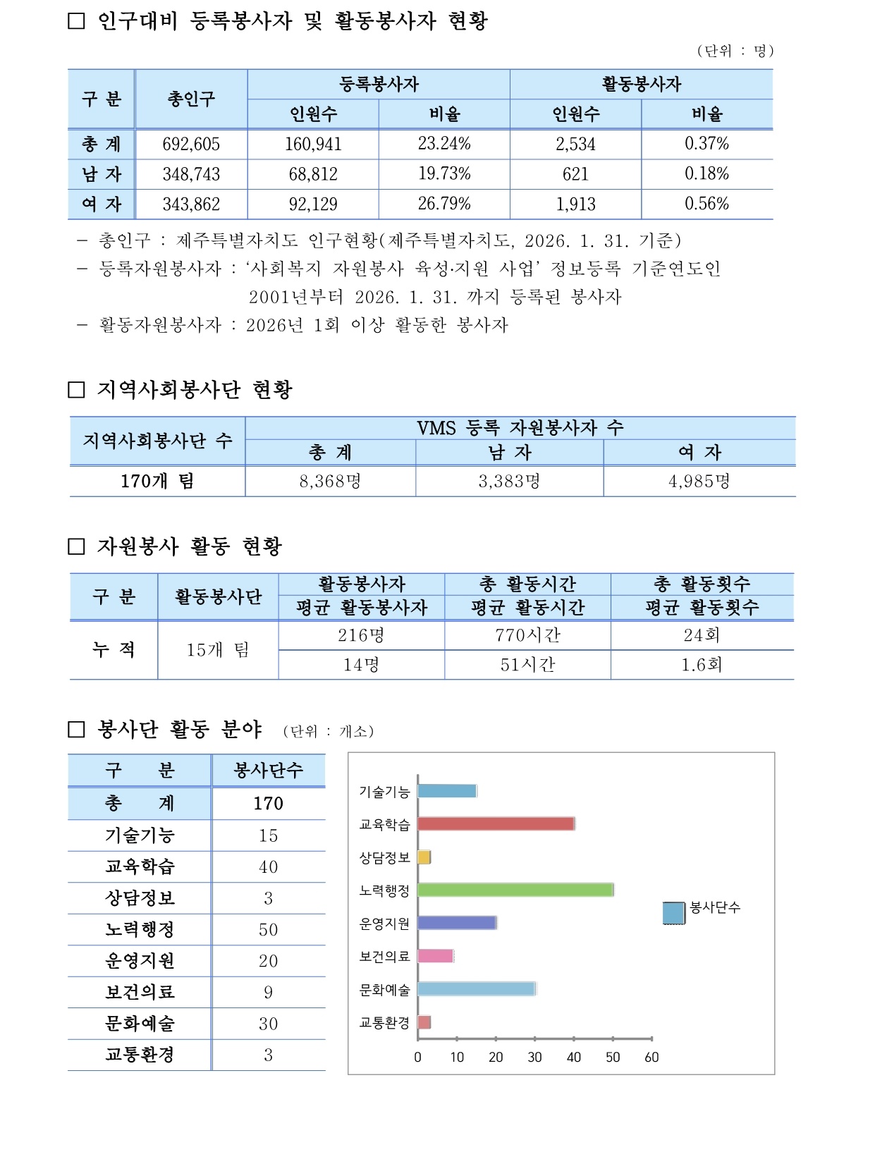 제주특별자치도 자원봉사 현황 (2026. 1. 31. 기준)