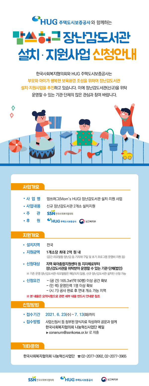 한국사회복지협의회는 HUG 주택도시보증공사와 함께 부모와 아이가 행복한 보육환경 조성을 위한 「2021년 맘쓰허그 장난감도서관 설치·지원사업」을 추진합니다.  관심있는 기관(단체)에서는 기한내 신청하여 주시기 바랍니다.