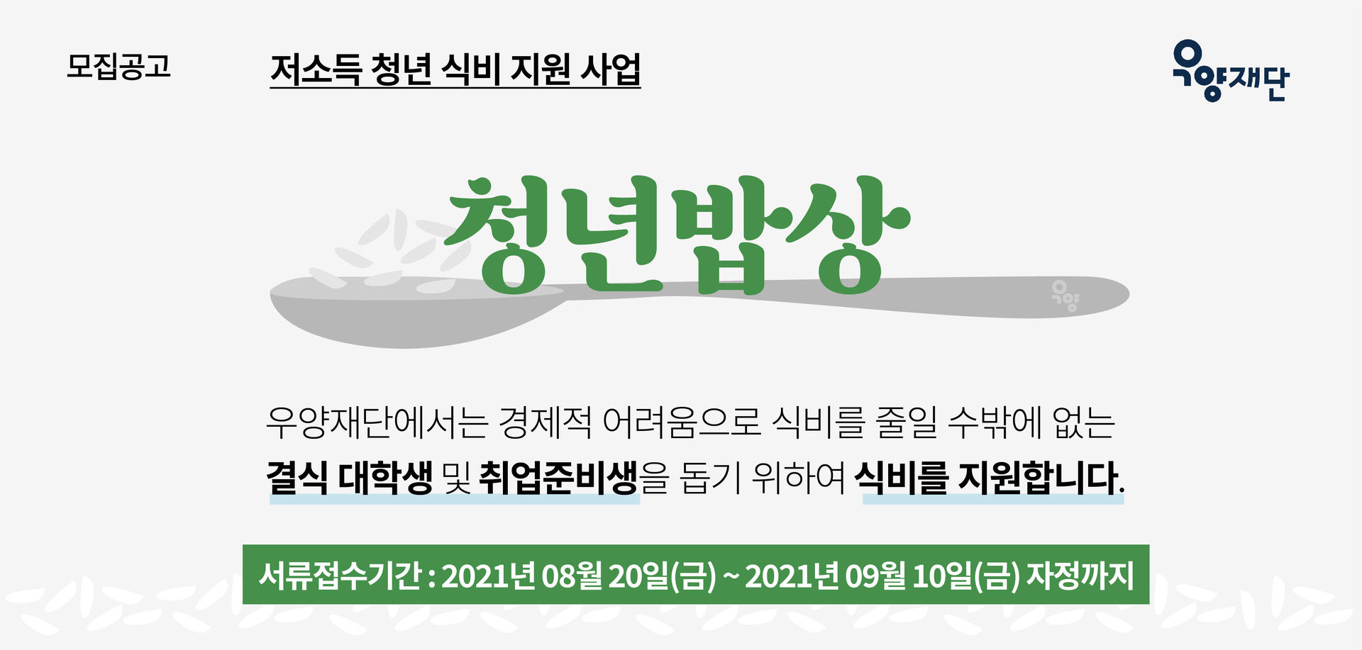 사회공헌공모 [우양재단] 저소득 청년 식비 지원사업 '청년밥상' 모집공고(~9.10.한)