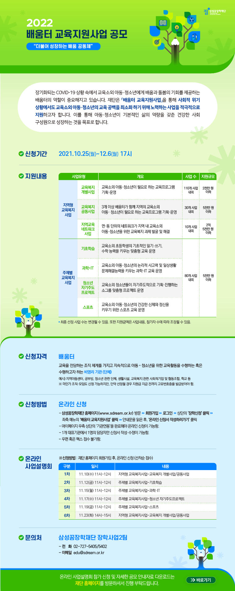 삼성꿈장학재단에서는 아동 · 청소년을 위한 교육활동을 수행할 비영리 기관(단체)을 모집합니다.