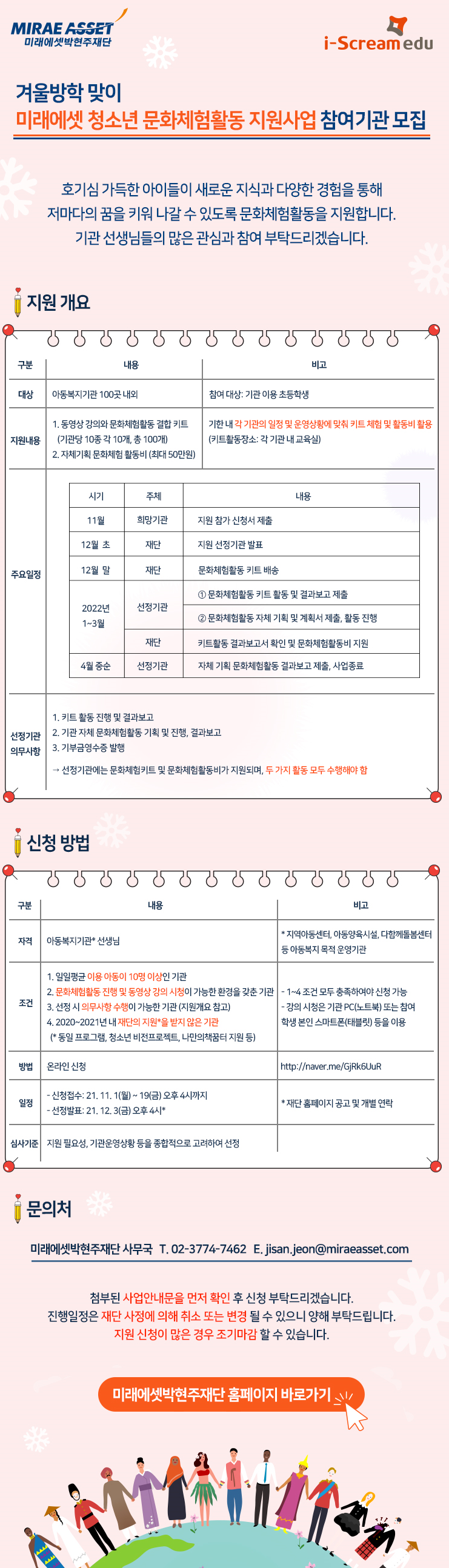 미래에셋박현주재단에서는 초등학생을 대상으로 '겨울방학 맞이 미래에셋 청소년 문화체험활동 지원사업' 을 수행할 참여기관을 모집합니다.