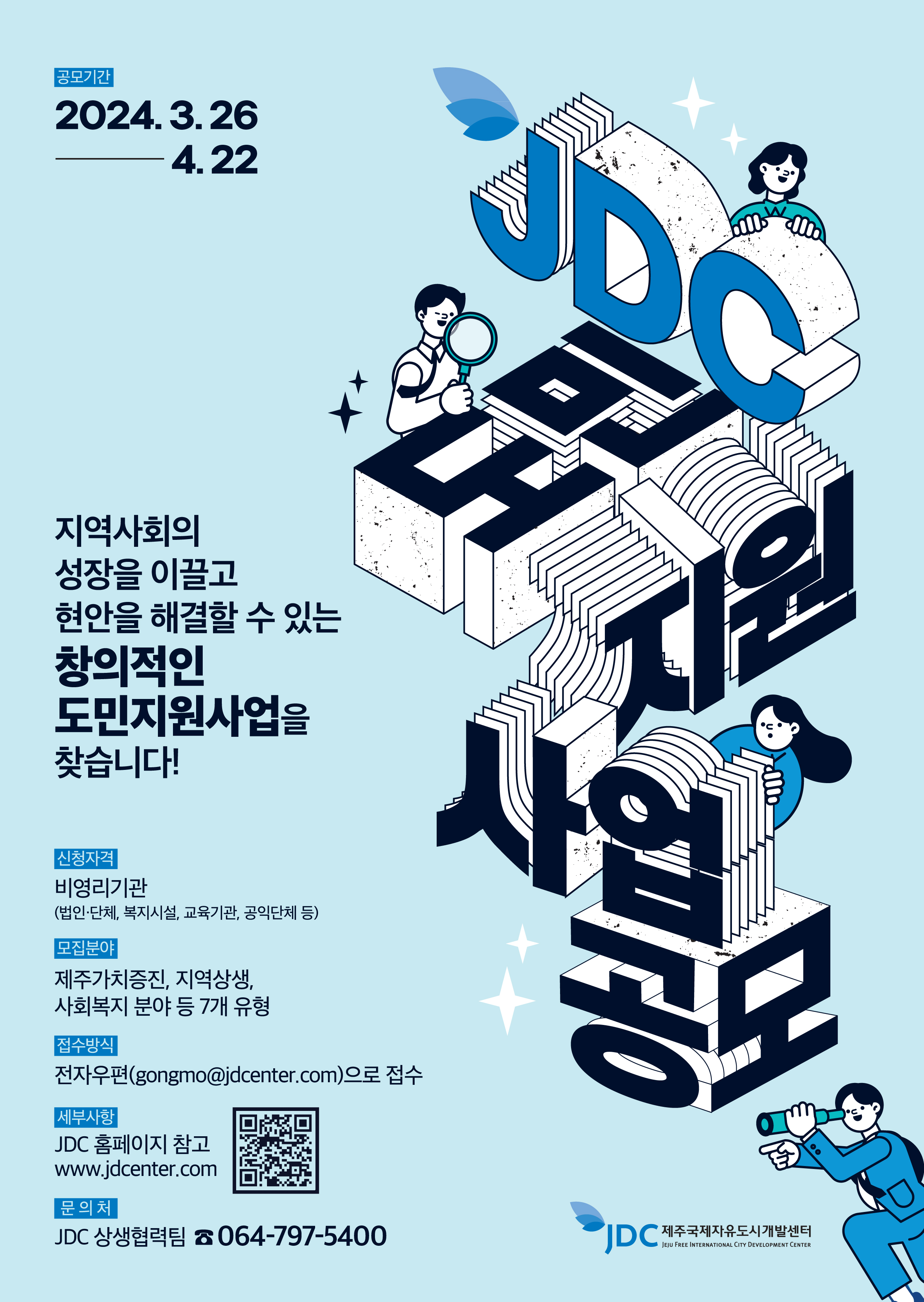 「2024년 JDC 도민지원사업」 공개모집 계획을 다음과 같이 공고하오니 많은 관심과 참여 바랍니다.