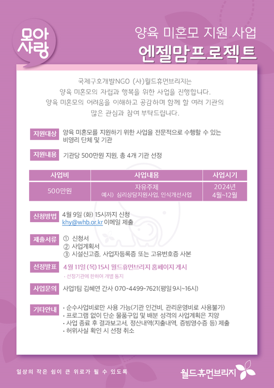 자세한 내용은 월드휴먼브리지 홈페이지 whb.or.kr > 참여 > 공모사업을 참고하시기 바랍니다.