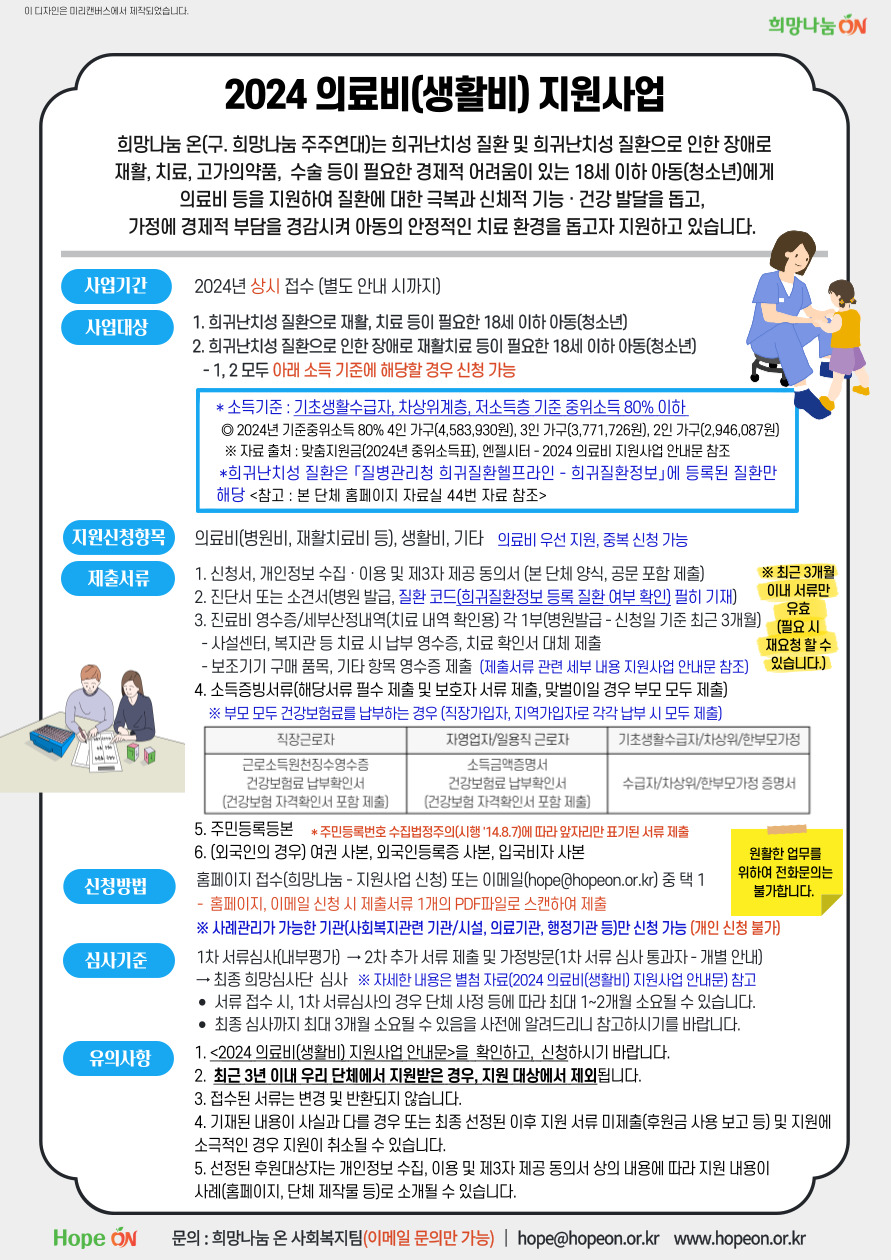 자세한 내용은 희망나눔 온 홈페이지 게시판을 참고해주시기 바라며, <2024년 의료비(생활비) 지원사업 안내문>을 꼭 내려받아 참고해 주시길 바랍니다.