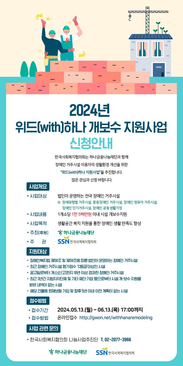 한국사회복지협의회는 하나금융나눔재단의 후원으로 장애인거주시설 이용인들이 편리한 환경에서 일상생활을 할 수 있도록 시설 개보수 지원을 위한, 『2024년 위드(with) 하나 개보수 지원사업』을 다음과 같이 공고하오니 관계자 여러분의 많은 관심과 지원 바랍니다.