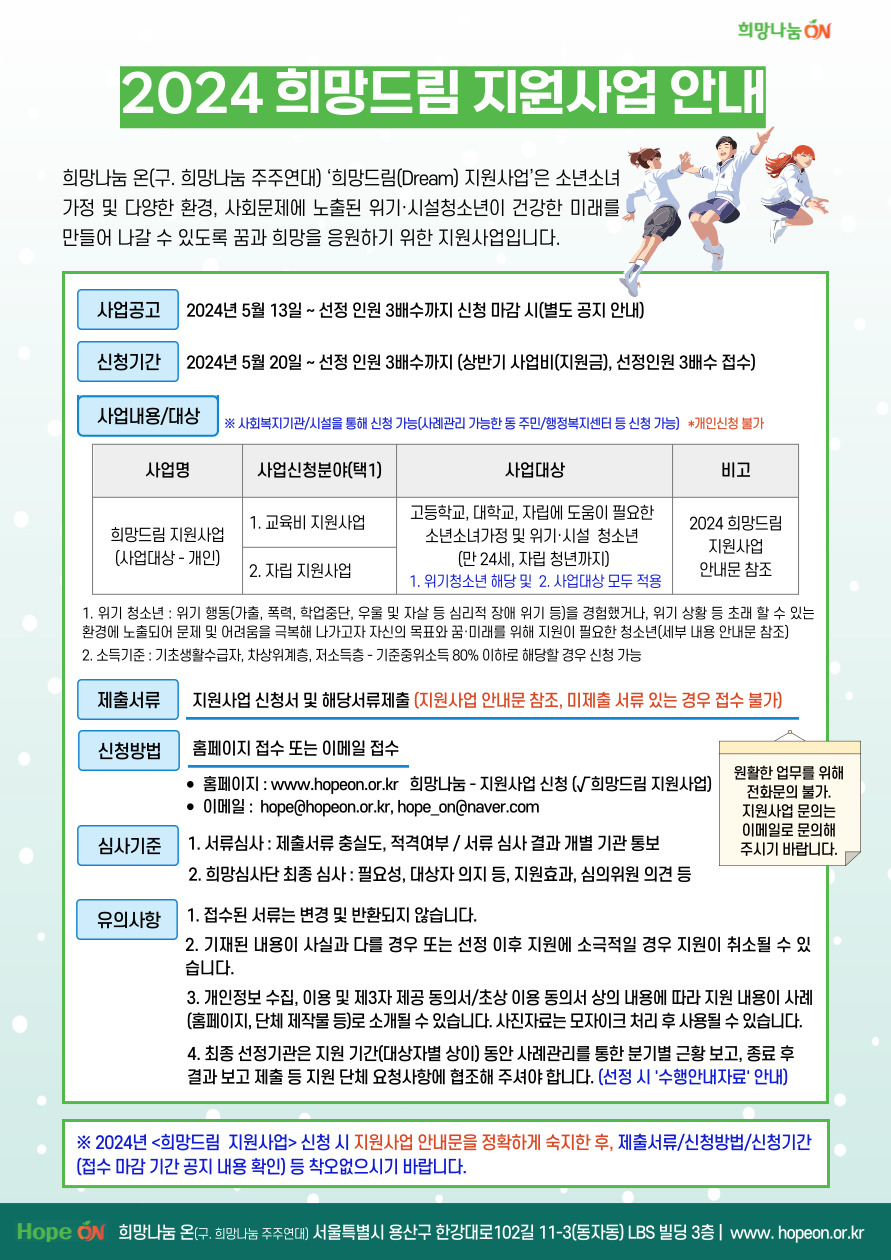 희망나눔 온에서는 2024년 ‘희망드림(Dream) 지원사업’을 공고하오니 많은 관심 부탁드리며, 지원사업에 대한 도움이 필요한 해당 청소년이 있는 기관에서는 신청해 주시길 바랍니다.