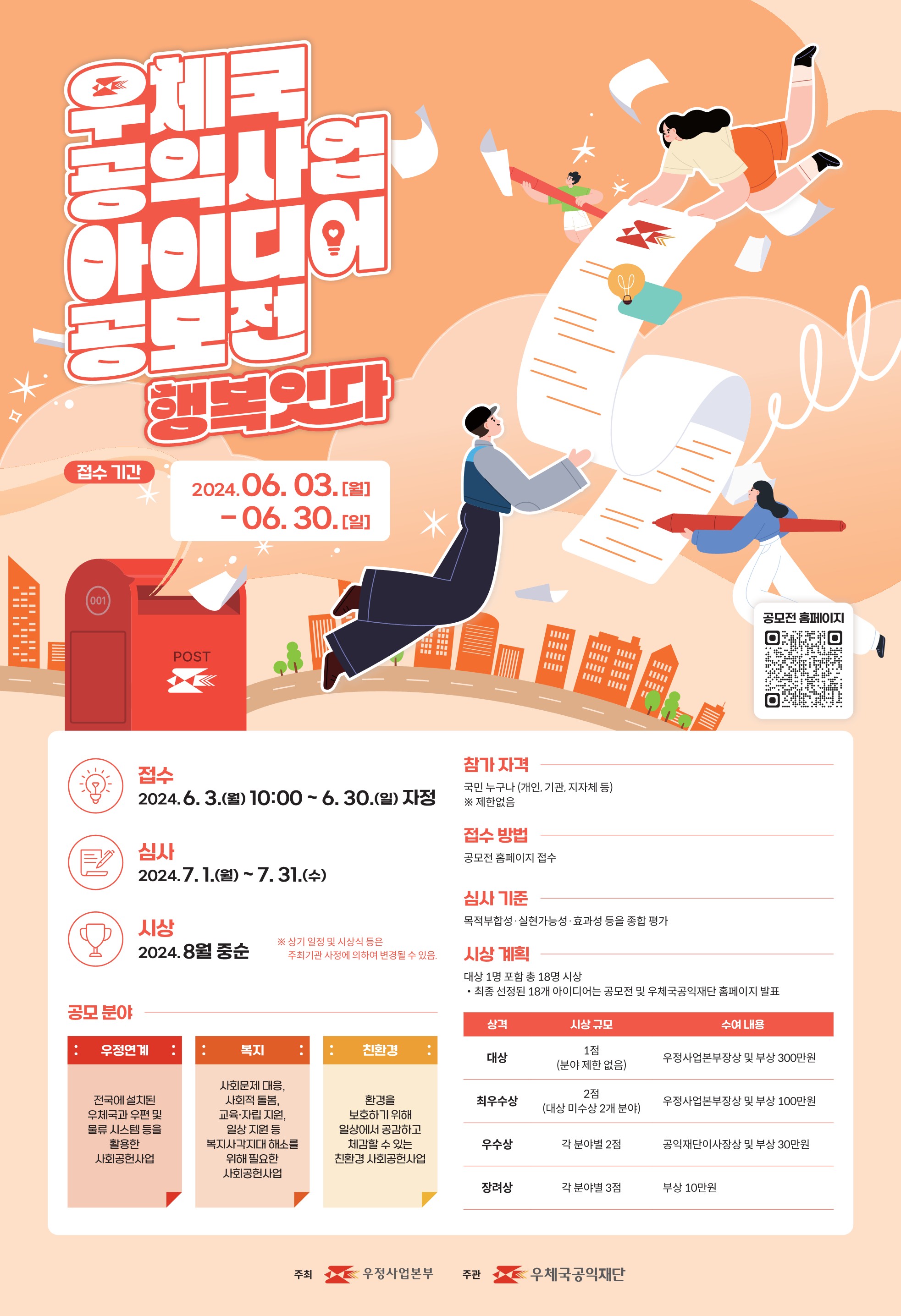 3개 분야(우정연계·복지·친환경)의 참신하고 혁신적인 아이디어 발굴을 통해 우체국 공익사업에 대한 국민의 공감대를 형성하고, 복지 사각지대 해소 등 사회적 가치를 확산하고자 하오니 많은 관심과 참여를 바랍니다.