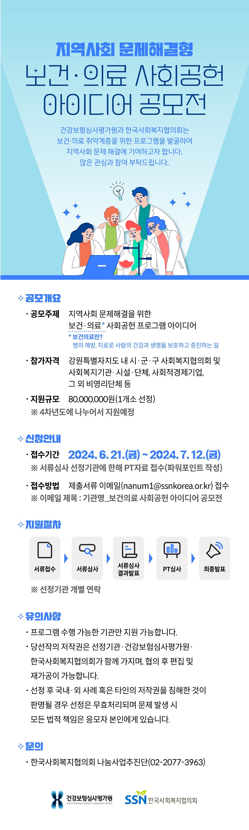 건강보험심사평가원과 한국사회복지협의회는 보건의료 취약계층을 위한 프로그램을 발굴하여 지역사회 문제 해결에 기여하고자 ‘제5회 지역사회 문제해결형 보건?의료 사회공헌 아이디어 공모전’을 추진합니다.