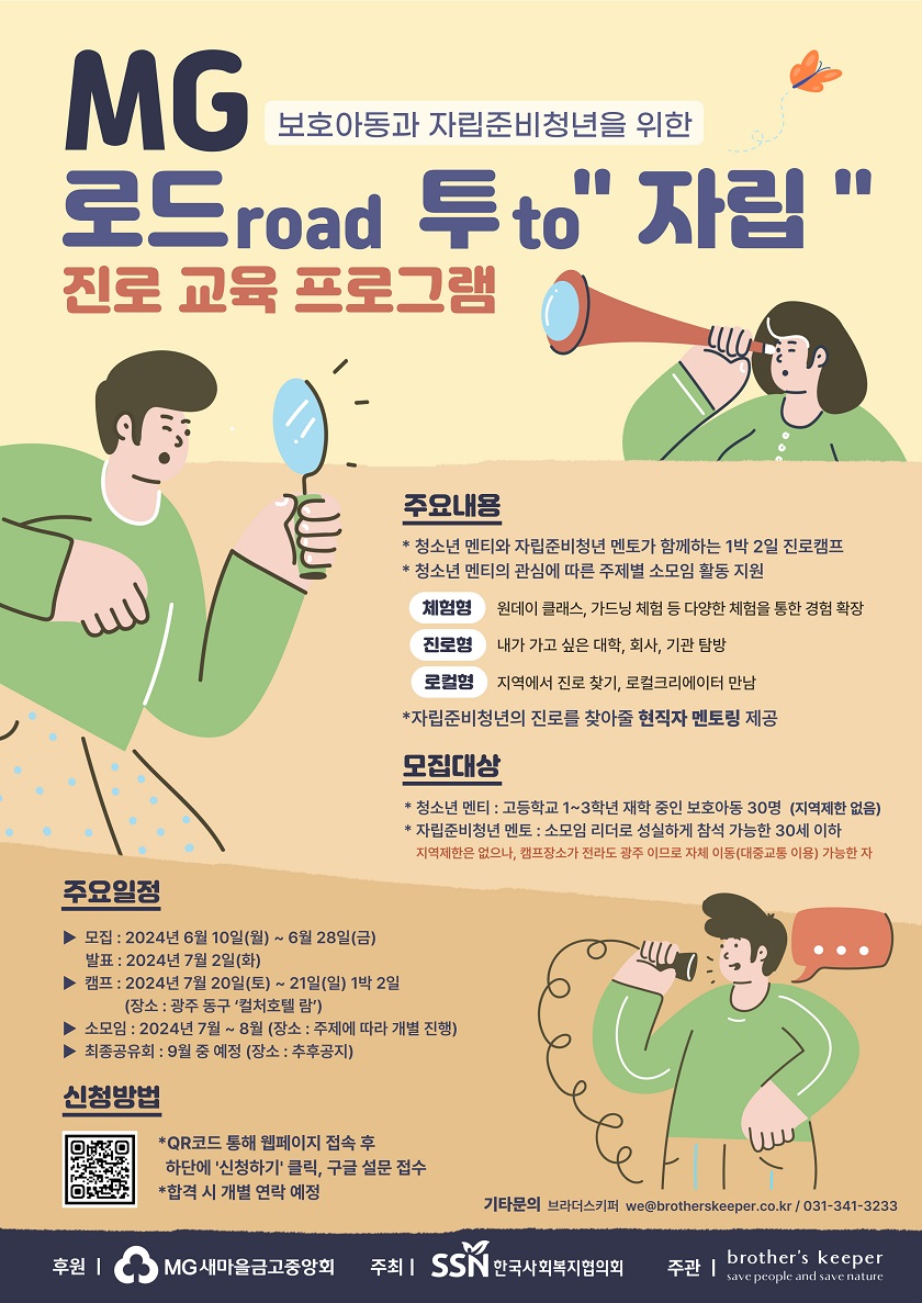 한국사회복지협의회는 MG새마을금고중앙회와 함께 보호종료를 앞두고 있는 자립준비청년들의 안정적인 자립을 위하여 「MG 로드 투 자립 진로교육 프로그램」을 추진하고 있습니다. 이에 2024년 MG 로드 투 자립 진로교육 프로그램 참여 대상자를 다음과 같이 모집하오니 많은 관심과 신청 바랍니다.