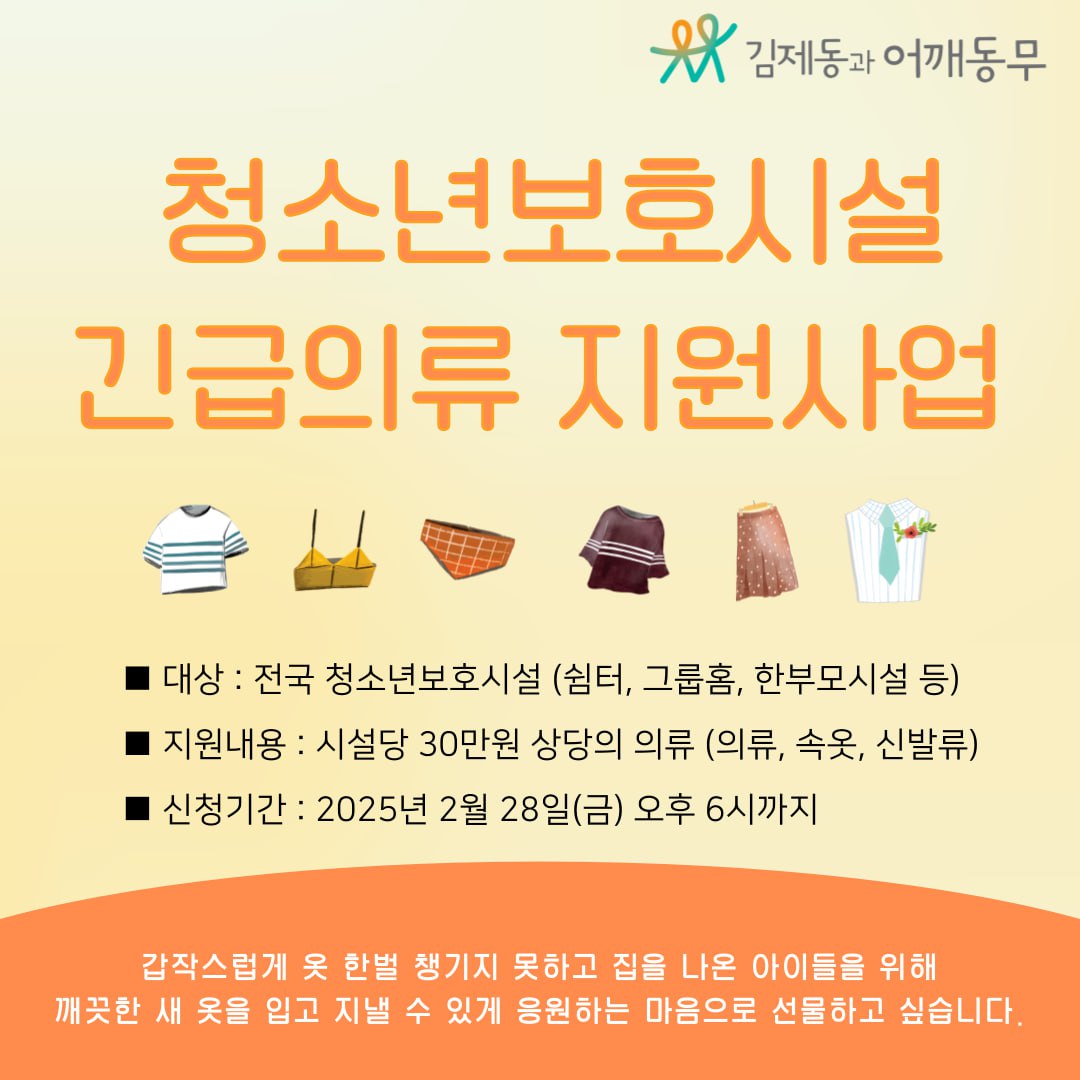 김제동과어깨동무에서 2025년도 상반기 청소년보호시설의 긴급의류 지원사업을 진행합니다.