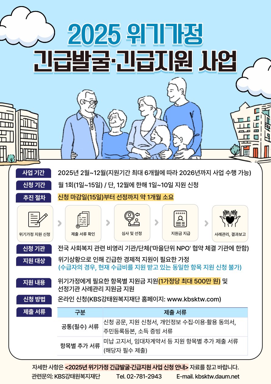 사회공헌공모 [KBS강태원복지재단] 2025 위기가정 긴급발굴·긴급지원 사업 안내(3월)