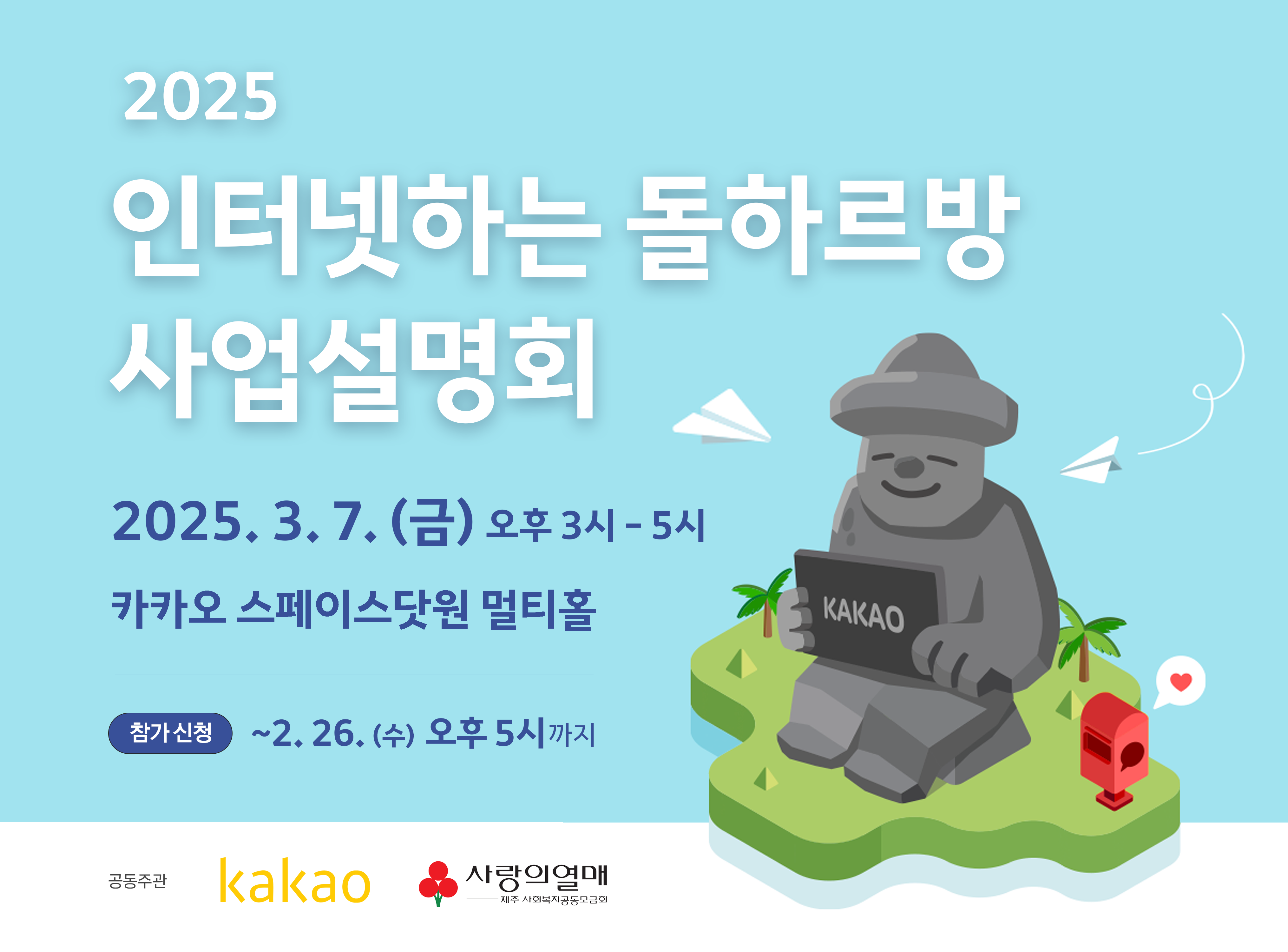 이번 사업설명회에서는 인터넷하는 돌하르방 사업의 취지와 2025년의 사업 운영 방향을 공유하고, 주요 변경사항 및 신청서 작성 방법과 인터넷하는 돌하르방 카카오톡 채널 활용 등을 안내할 예정입니다.
