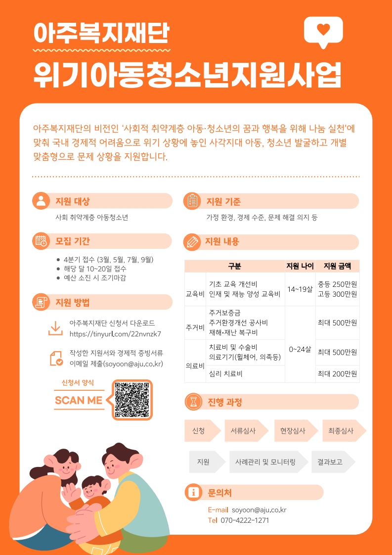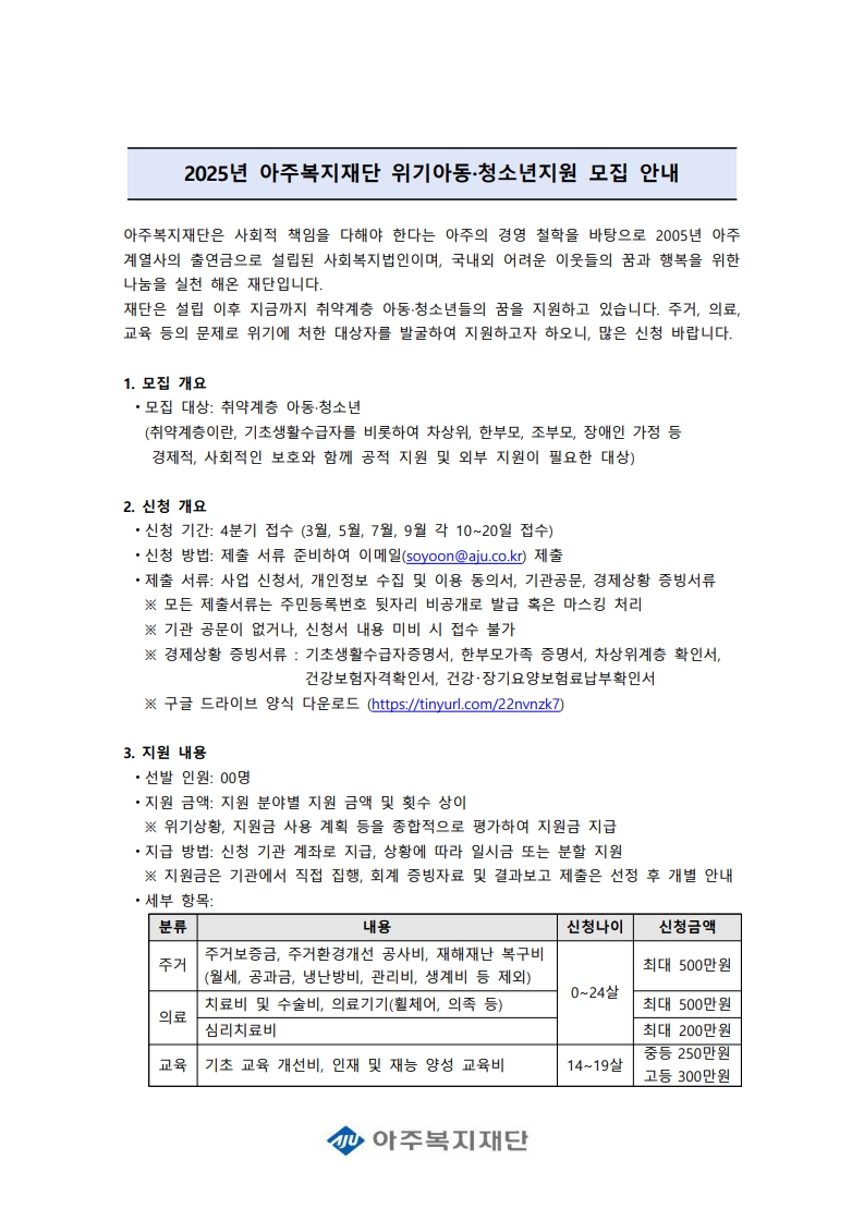 6. 문의: 아주복지재단 최소윤 매니저 / soyoon@aju.co.kr / 070-4222-1271