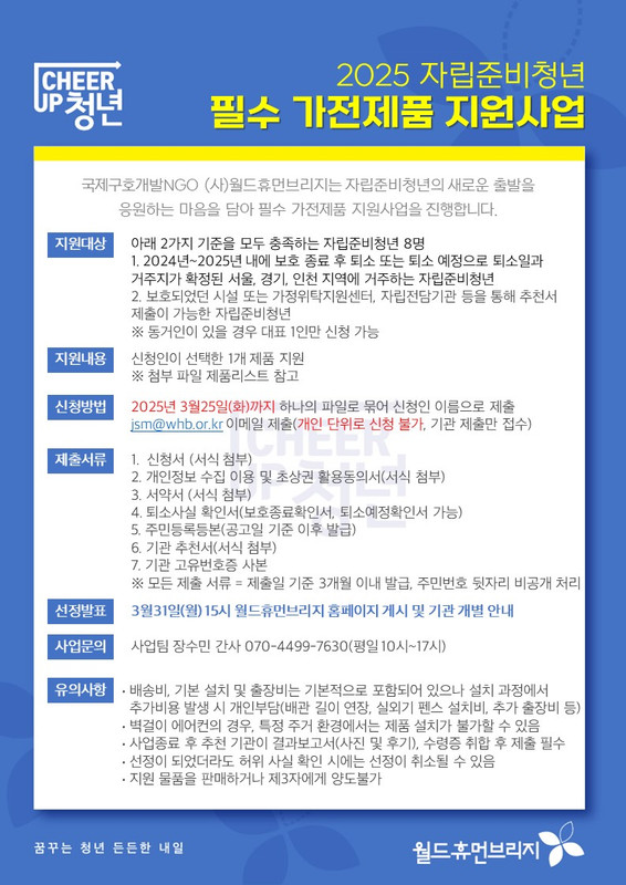 ※ 자세한 내용은 월드휴먼브리지 홈페이지 whb.or.kr > 소식 > 공지사항을 참고하시기 바랍니다.