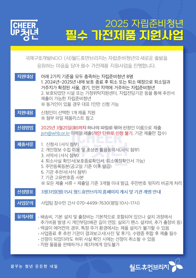 사회공헌공모 [월드휴먼브릿지] 2025 자립준비청년 필수 가전제품 지원사업